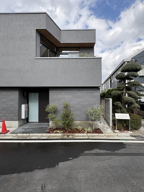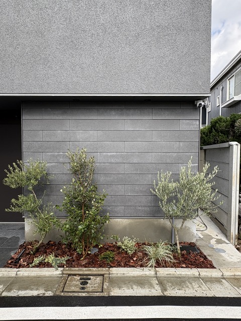 八幡山の家の外観は、落ち着きのあるグレーを基調としたシャープなデザインです。外壁を引き立てる玄関アプローチの植栽には、オリーブなどをはじめとする「常緑樹」を中心にご提案させていただきました。