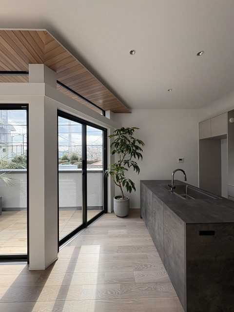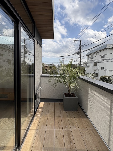 内に入ると、木目を活かした温かみのあるLDKが広がります。 リビングには大きな開口部を設け、外のバルコニーへとフラットに繋がる設計にしました。バルコニーの床は一見すると木の温もりを感じるウッドデッキのようですが、実際はメンテナンス性に非常に優れた「木目調タイル」を採用しています。天然木のように腐食や退色の心配が少なく、日々のお掃除が格段に楽になるのがメリットです。